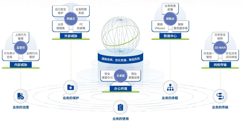 數(shù)字化轉(zhuǎn)型的核心目標(biāo)是“提高效率、優(yōu)化資源、降低風(fēng)險(xiǎn)”,業(yè)務(wù)場(chǎng)景包含“業(yè)務(wù)保護(hù)、業(yè)務(wù)使用、業(yè)務(wù)傳輸、業(yè)務(wù)承載”,將核心目標(biāo)與業(yè)務(wù)場(chǎng)景相結(jié)合,可明確數(shù)字化轉(zhuǎn)型關(guān)鍵任務(wù)為“體系化外部防御、規(guī)范化內(nèi)部治理、敏捷化安全桌面、智能化網(wǎng)絡(luò)傳輸、扁平化數(shù)據(jù)中心”。企業(yè)可進(jìn)一步結(jié)合自身的發(fā)展情況,從最為緊迫的關(guān)鍵任務(wù)入手,一步步走好轉(zhuǎn)型之路。
